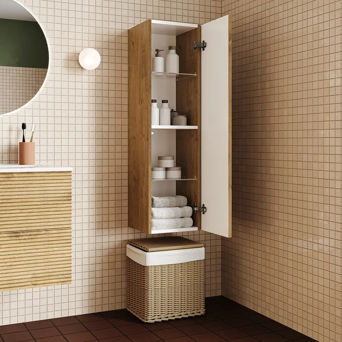 Подвесной пенал для ванной комнаты Bild – красивый дизайн со структурной вертикальной фрезеровкой в сочетании с теплым оттенком дуба, удобством и практичностью. Универсальная ориентация: пенал можно подвесить так, чтобы дверки открывались в удобную вам сторону (пенал можно перевернуть на 180 градусов, при этом перевешивать дверцы не нужно).