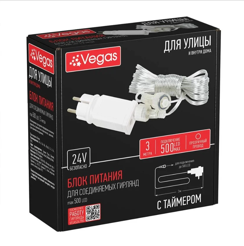 Мощность 12 W. Цвет провода прозрачный. Длина провода 300 см. Имеет таймер, 6 часов гирлянды светят, 18 часов гирлянды выключены. Степень защиты IP44. Температурный режим от -30 до +50, и относительной влажностью 80%. Имеет возможность подключения до 500 LED.