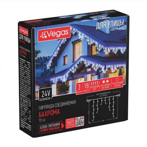 Электрогирлянда-конструктор VEGAS Бахрома, 24 V, 72 холодных LED ламп, 55007 предназначена для создания декоративной и праздничной иллюминации на улице и дома.