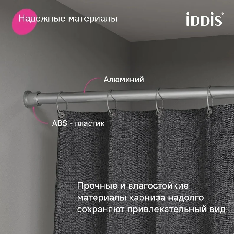 Карниз универсальный: подойдет для ванной, жилой комнаты, гардеробной и балкона. Может быть установлен на любой тип поверхности.