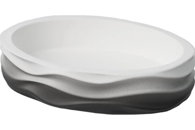 Изготовленная из высококачественного полирезина, мыльница MIST сочетает в себе прочность и изысканность. Её минималистичный дизайн и волнообразная форма создают ощущение лёгкости и гармонии, а градиентный переход от белого к темно-серому цвету добавляет аксессуару изысканности и уникальности.