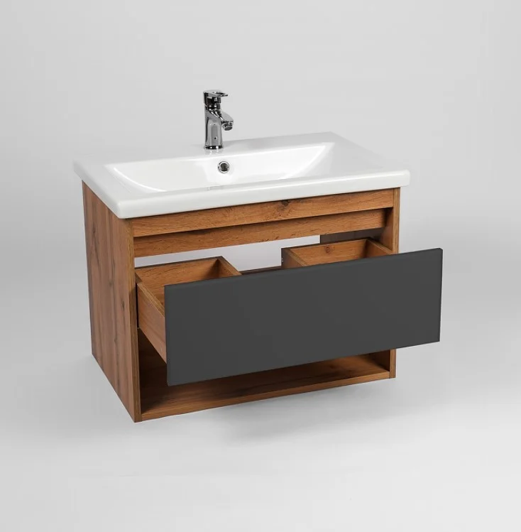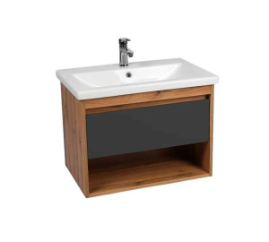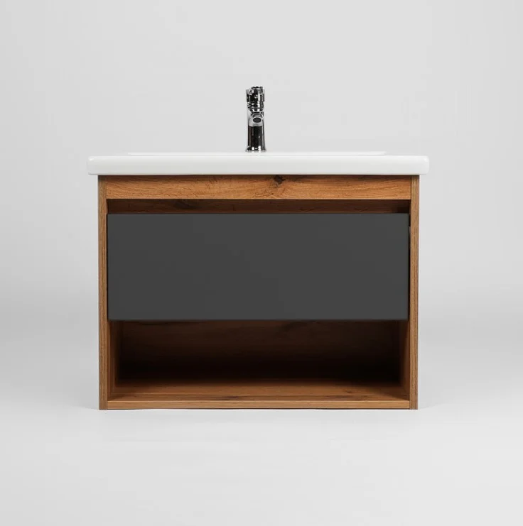 Тумба под раковину VIANT Бостон 50 VBOS50COG-T1YP — идеальный выбор для современной ванной комнаты. Эта подвесная тумба выполнена в стильном графит матовом и дубовом оттенке, что добавляет элегантности и функциональности вашему интерьеру. Данный предмет интерьера оснащен системой хранения с выдвижным ящиком и открытой полкой, что обеспечивает удобство и порядок в вашей ванной комнате.
