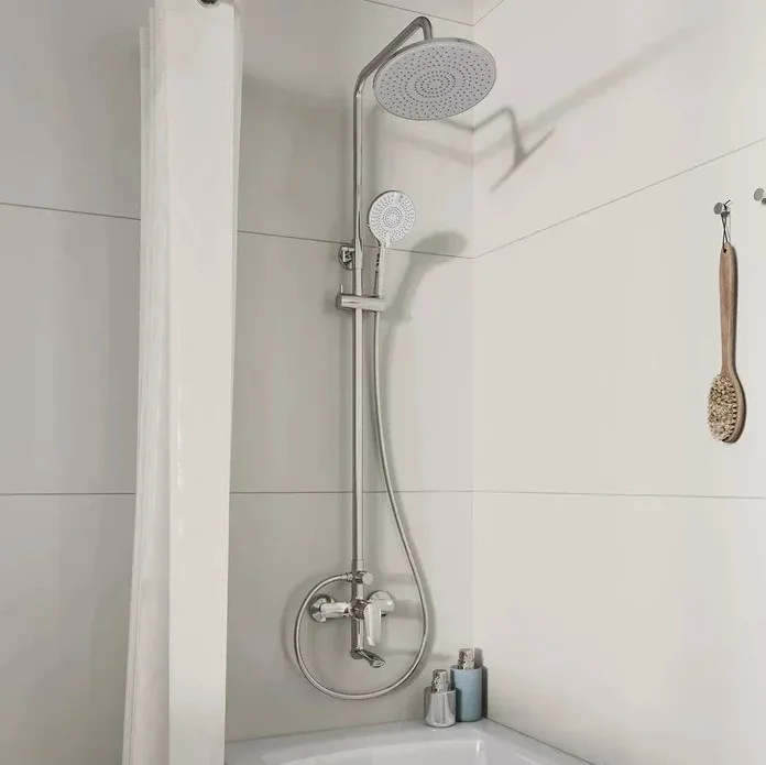 • 3-режимная ручная лейка (120 мм) с держателем, душевой шланг (1,5 м), штанга для душа с возможностью регулировки по высоте и крепеж идут в комплекте.