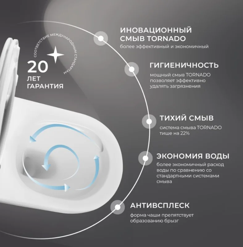 Благодаря мощному смыву TORNADO обеспечивается абсолютная чистота внутренних стен чаши с первого смыва и без брызг