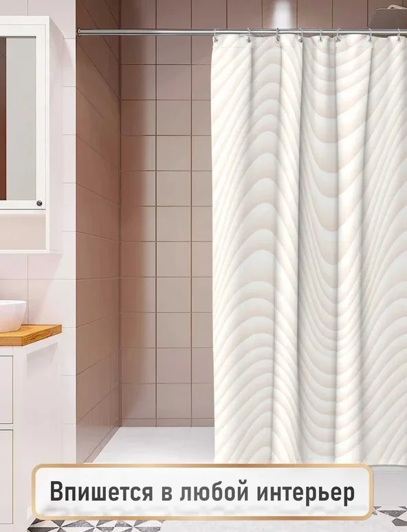В нижний край шторки вшит утяжелитель. Поэтому изделие не будет загибаться, разлетаться или липнуть к телу во время водных процедур.