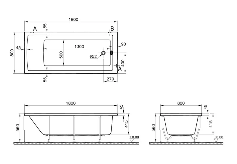 Расположение слива: В ногах (диаметр 52 мм)