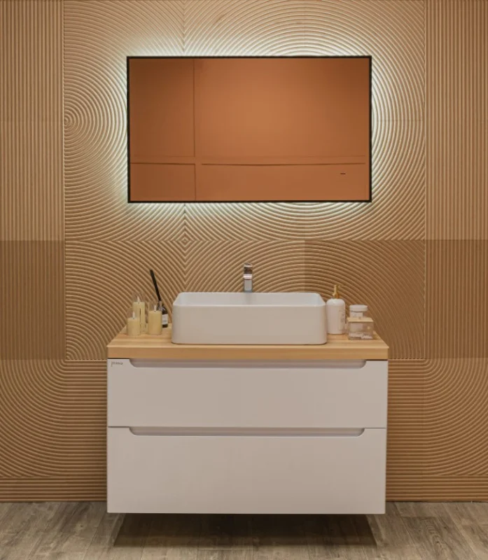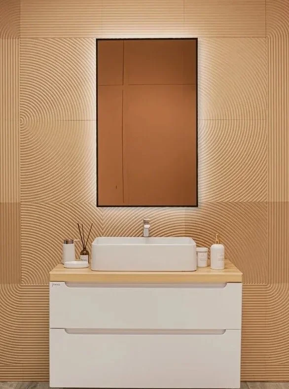 Тонкая окантовка с нанесением краски отвечает глобальному тренду на интерьерный минимализм, смотрится легче, чем традиционная рама и при этом чётко выделяет границы зеркала. Контраст с окружающей поверхностью и подсветка с эффектом «парения» делают модель выразительной деталью интерьера.