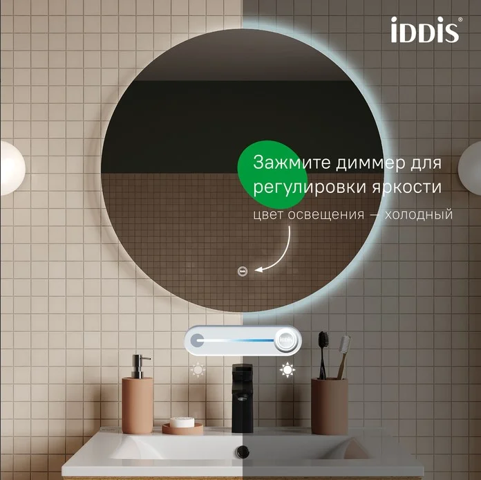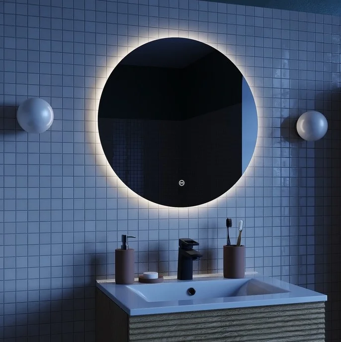 Стильное круглое зеркало Bild диаметром 60 см со встроенной LED-подсветкой. Не имеет рамы, за счёт чего смотрится воздушно и легко, и благодаря универсальному дизайну украсит интерьер любой ванной.