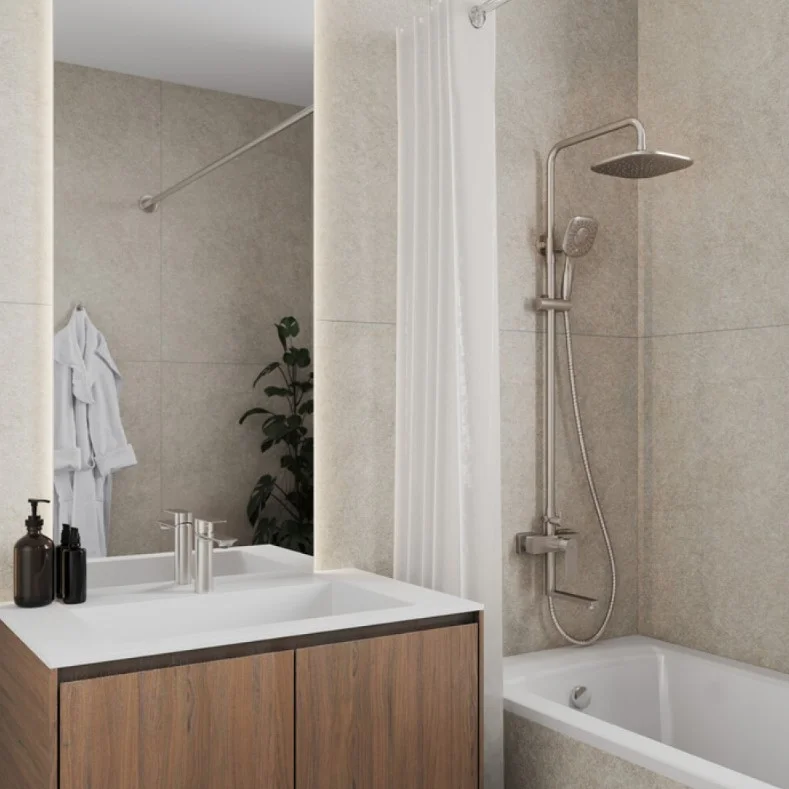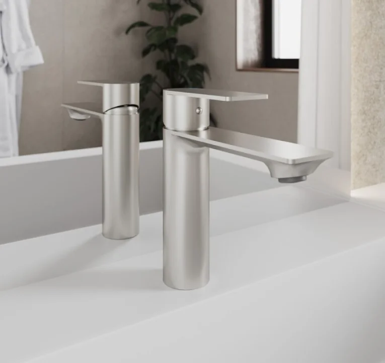 Четкие линии излива гармонично сочетаются с мебелью разных стилей и умывальниками популярных форм: с плавными или угловатыми линиями.