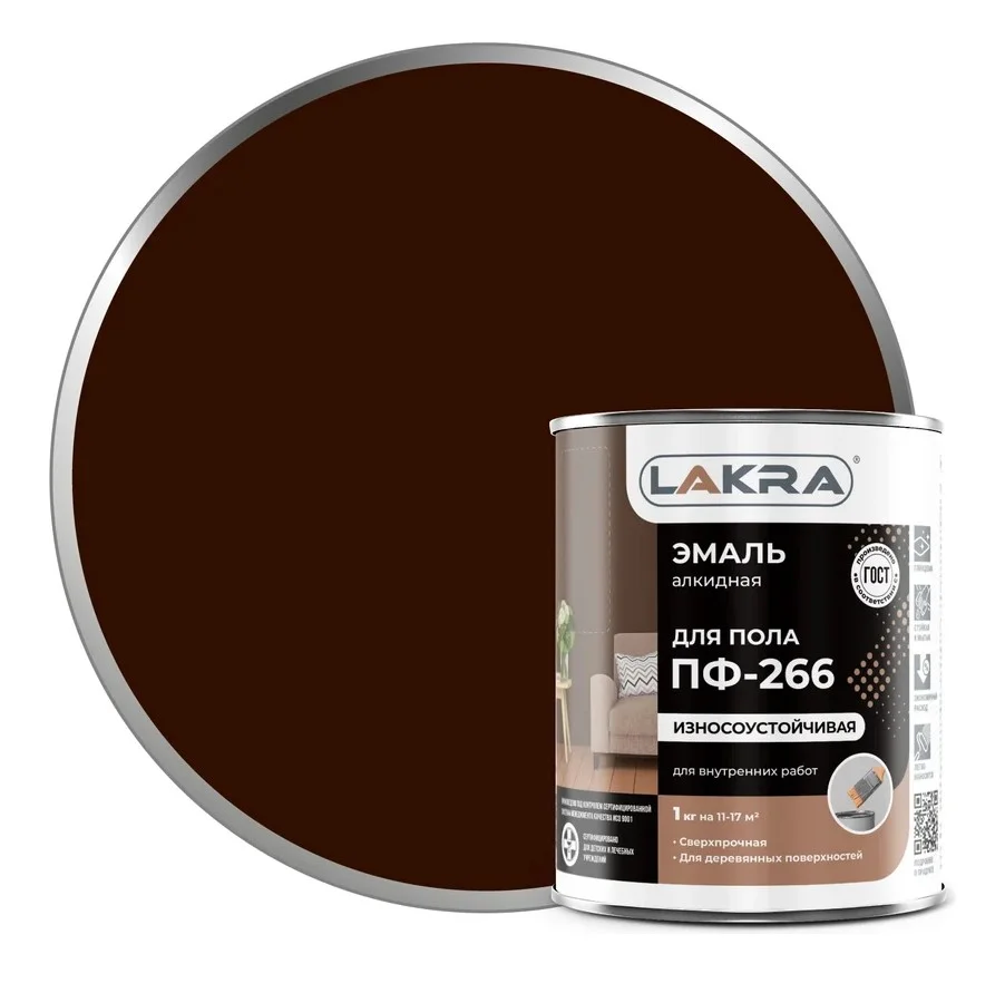 Эмаль ПФ-266 ЛАКРА основе алкидного лака, для внутренних работ. В результате нанесения, эмаль образует ровное гладкое глянцевое покрытие, с высокой степенью истирания, влагоустойчивое. Предназначена для покрытия окрашенных и неокрашенных деревянных полов. Быстро сохнет, не оставляет подтеков и следов от малярных инструментов. Для нанесения можно использовать валик ил кисть.