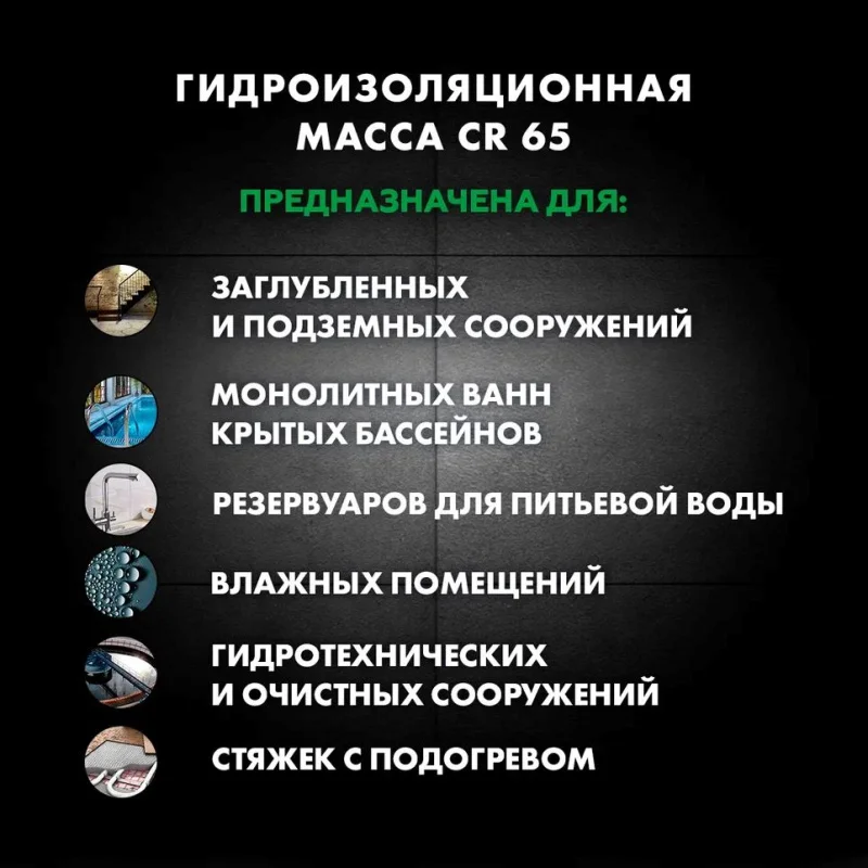 Смесь CR 65 предназначена для устройства водонепроницаемых покрытий на недеформирующихся незасоленных минеральных (не содержащих гипс) основаниях, на полах и стенах, внутри и снаружи зданий.