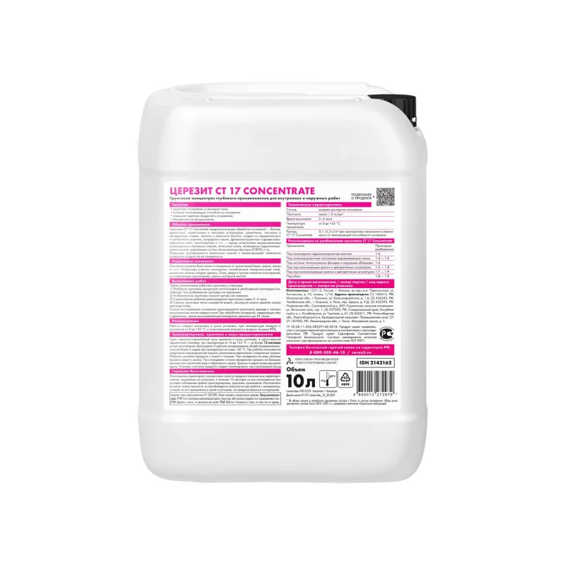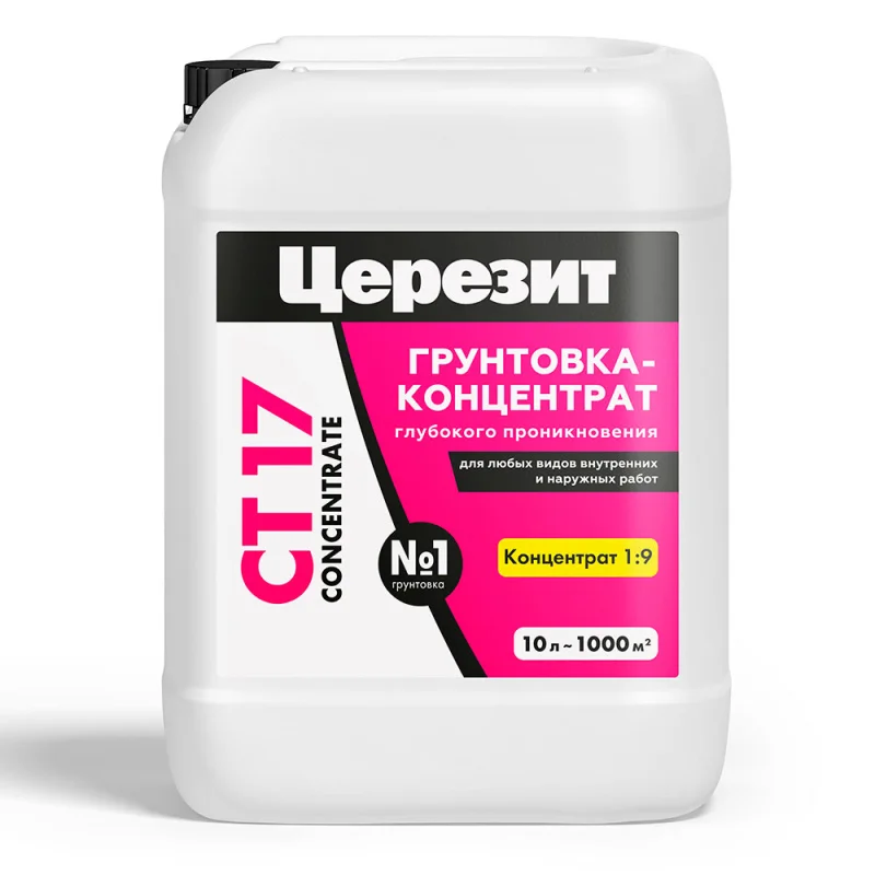 Грунтовка CT 17 Concentrate предназначена для обработки впитывающих, сильно впитывающих и непрочных оснований – бетона, цементных, известковых и гипсовых штукатурок, цементных, гипсовых и ангидритных стяжек, легкого и ячеистого бетона, кладок из керамического и силикатного