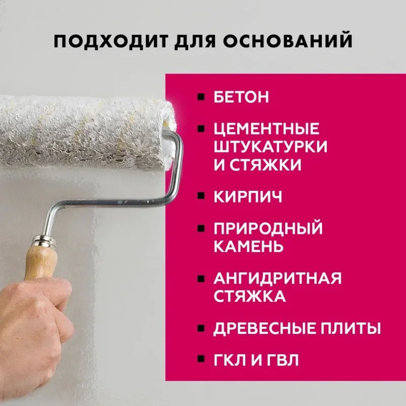 кирпича, природного камня, древесностружечных и древесноволокнистых плит, гипсокартона и т.п. – перед нанесением выравнивающих штукатурных и напольных смесей, плиточных клеев, полимерных гидроизоляционных мастик, креплением систем теплоизоляции фасадов (СФТК) и т.д.