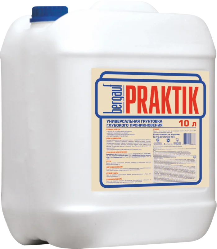 Грунтовка BERGAUF Praktik для использования внутри и снаружи помещений. Используется на различных типах поверхностей, включая бетон, штукатурку, гипсокартон и даже окрашенные поверхности масляными или пентафталевыми красками. Эта грунтовка способна снижать расход наносимых материалов, укреплять поверхность основания и увеличивать адгезию финишных материалов.