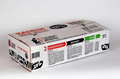 В коробке три вида камня по 10 кг: талькохлорит, кварцит, дунит. Это камни с различной теплоемкостью, они укладываются в следующем порядке: на дно каменки кладется менее теплоемкий камень для быстрого прогрева – кварцит. На него укладывается дунит и сверху – талькохлорит, имеющий наибольшую теплоёмкость и красивый внешний вид. Таким образом, Вы получаете сбалансированную смесь разных камней, каждый из которых имеет различные теплофизические и литотерапевтические свойства.