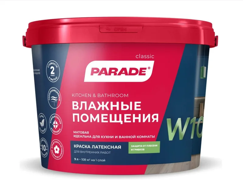 PARADE W100 является высококачественной краской для стен и потолков, предназначенная для использования в помещениях с повышенной влажностью. Она идеально подходит для окраски ванных комнат, кухонь, бассейнов и других влажных помещений, где требуется прочное и влагостойкое покрытие.
