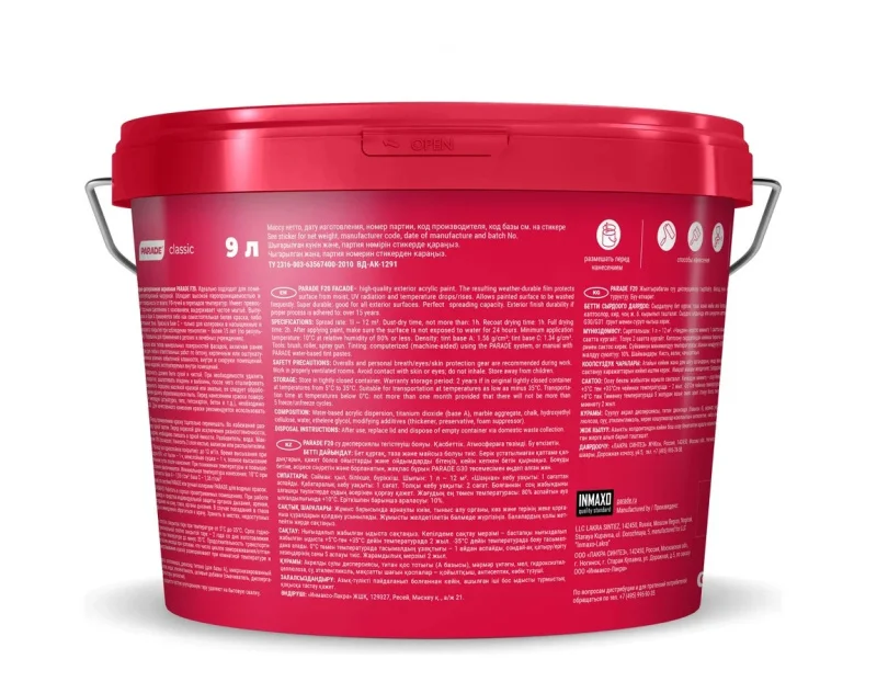 Краска фасадная PARADE F20 база А 9 л - акриловая водно-дисперсионная фасадная краска. Образует паропроницаемое матовое покрытие, устойчивое к атмосферным воздействиям, УФ лучам, перепаду температур, влаге. Обладает высокими декоративными свойствами, отличной укрывистостью и прочным сцеплением с основанием.