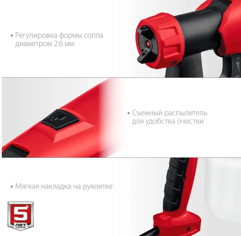Расходная емкость объемом 800 мл позволяет длительно работать на одной заправке и не нагружает руки оператора