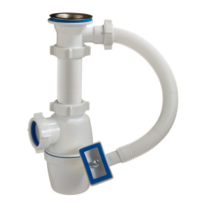 Сифон с большим корпусом и отстойником, прямоугольным переливом, выпуском, нержавеющей чашкой д.70мм для мойки с прямоугольным переливом. В комплекте две прокладки на перелив - для круглой и прямоугольной формы мойки. Необходим отвод в канализацию.