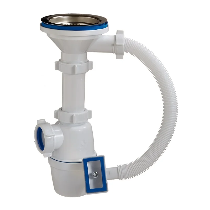 Сифон с большим корпусом и отстойником, выпуском с нержавеющей чашкой д.114мм для мойки с прямоугольным переливом. В комплекте идут две прокладки на перелив – прямоугольная на квадратную форму мойки и полукруглая на круглую форму мойки. Необходим отвод в канализацию.