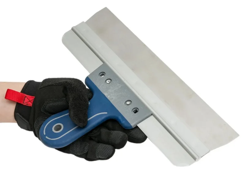 Шпатель имеет прорезиненную рукоять, выскальзывание инструмента во время работы исключается.