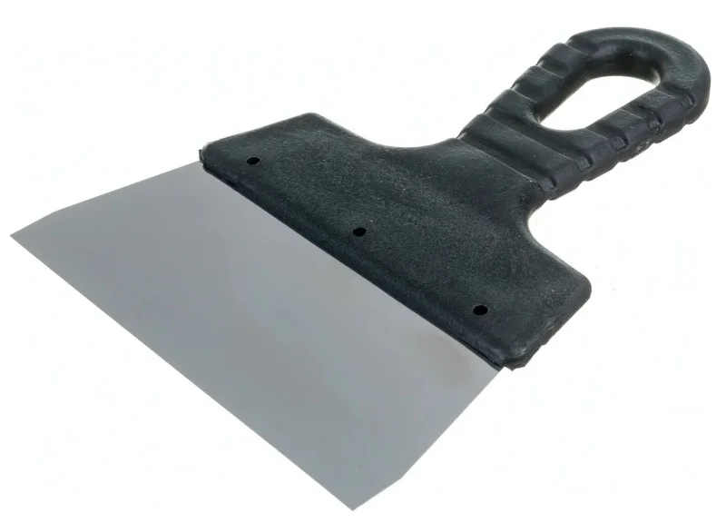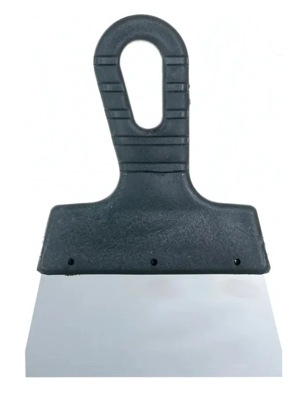 Нержавеющее стальное полотно прямоугольной формы, пластмассовая ручка.