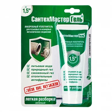 Герметик «СантехМастерГель» зелёный— гель-герметик предназначенный для уплотнения резьбовых и фланцевых металлических соединений диаметром до 1,5 дюймов. Надежно герметизирует резьбу, полученное соединение устойчиво к различным средам, высокому давлению и вибрациям, обеспечивает защиту резьбы от коррозии. Полимеризация геля происходит внутри резьбы, в отсутствии кислорода. Продукт имеет СЭЗ на применение в системах с горячей и холодной питьевой водой.