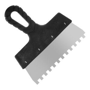 Нержавеющее стальное полотно прямоугольной формы с зубчатыми выступами, пластмассовая ручка.