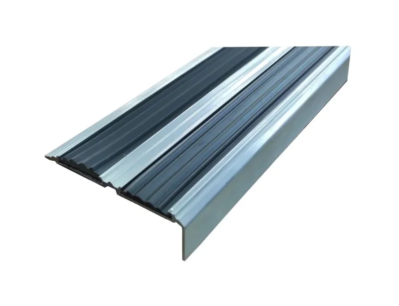 Алюминиевый угол-порог с двумя резиновыми вставками 81 мм предназначен для установки на углах ступеней лестниц в качестве противоскользящего профиля безопасности и как декоративная отделка. Увеличенная поверхность против скольжения.