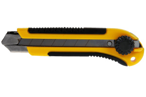 ехнический нож с вращающимся прижимом FIT IT 25мм - этот простой инструмент подойдет для разрезания проводов, шнуров, картона, линолеума и т.п. Выдвижное лезвие изготовлено из инструментальной стали и состоит из отламывающихся сегментов. Корпус изготовлен из обрезиненного пластика, он обладает вращающимся прижимом лезвия.