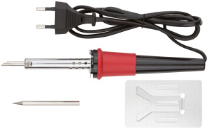 220 Вольт. В комплекте: подставка для пояльника, два сменных жала (игорьчатое, скошенное). Материал: инструментальная сталь, ручка из термостойкого пластика, медное жало, с защитным хромированным покрытием.