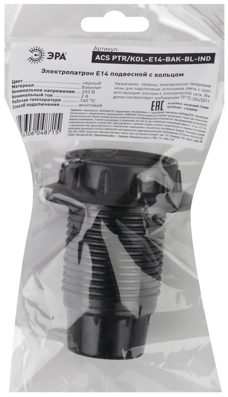Патрон Е14 бакелитовый подвесной черный представляет собой современное решение для организации освещения в жилых и коммерческих пространствах. Этот патрон выполнен из высококачественного бакелита, который известен своей долговечностью и устойчивостью к высоким температурам, что делает его идеальным выбором для длительного использования. Черный цвет корпуса придает изделию универсальный и стильный вид, который легко вписывается в любые интерьерные решения – от классического до ультрасовременного стиля.