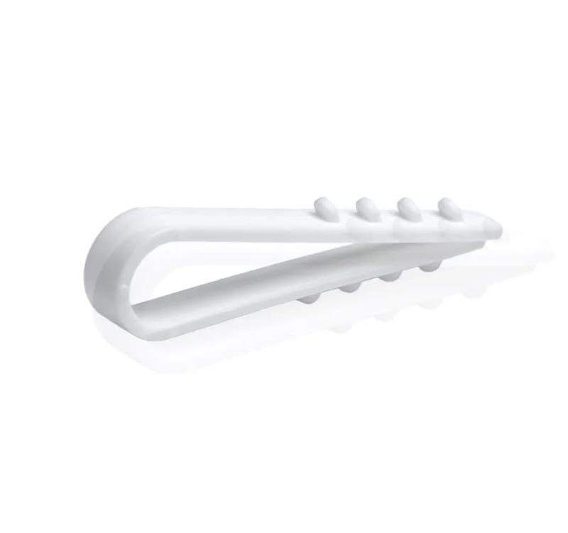 Дюбель-хомут надевается на провод и вставляется в просверленное отверстие. Он плотно фиксирует провод в нужном положении, предотвращая его смещение и создавая надёжное крепление. Такие крепежные элементы особенно полезны при прокладке электропроводки в стенах и потолках, а также при монтаже кабельных каналов.