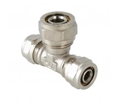 (VTm.331.N) Фитинг обжимной – тройник латунный никелированный для соединения металлопластиковых (металлополимерных) труб. Имеются равнопроходные и переходные модели.