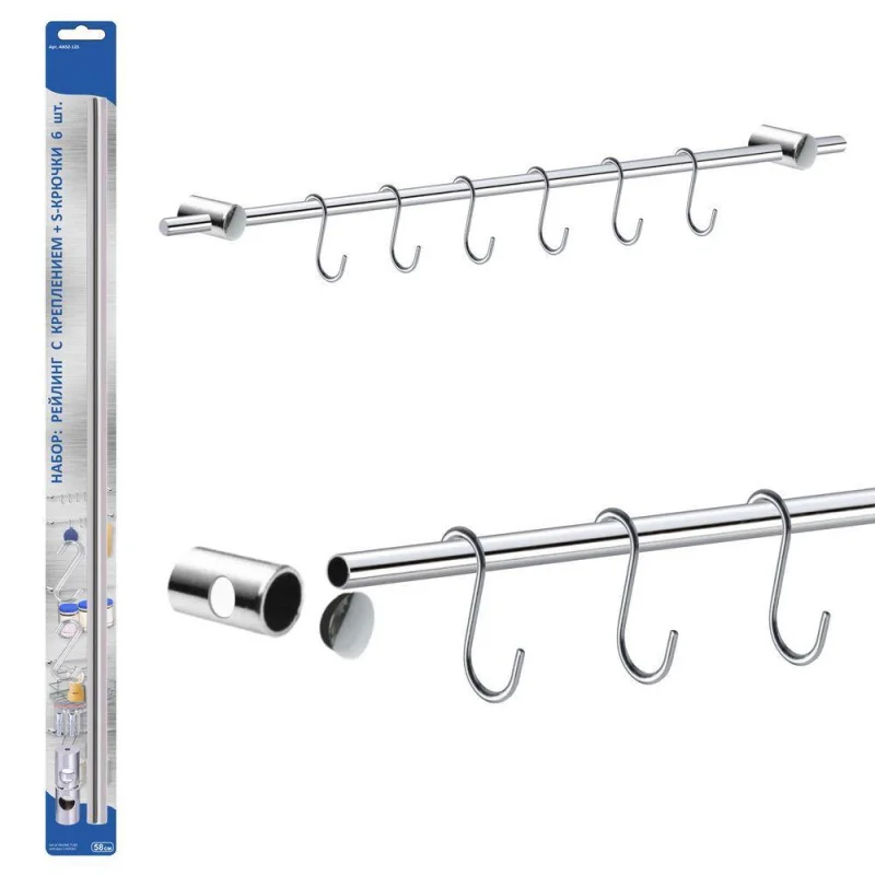 В набор входит все необходимое для размещения: рейлинг - 1шт (длина 58см, диаметр 16мм), держатели для рейлинга-2шт, заглушки рейлинга–2 шт, заглушки для держателей рейлинга – 2 шт, комплект креплений к стене (дюбели, шурупы), S-крючки – 6 шт (6,5х2см).