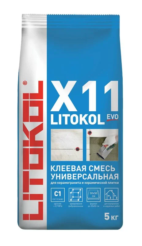 LITOKOL X11 EVO предназначен для укладки керамогранита, керамической плитки, клинкера, натурального камня с устойчивой структурой размером до 50х50 см на стабильные основания. Для внутренних и наружных работ.