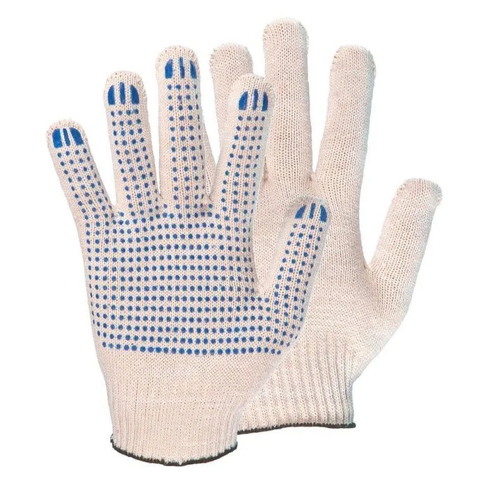 Перчатки хлопчатобумажные (Х/Б) с ПВХ напылением - средство для защиты рук, имеющее точечное ПВХ напыление на ладонной части. Способны защитить руки от производственных загрязнений, порезов, ссадин, химических и тепловых ожогов. Также перчатки обеспечивают защиту от скольжения и тем самым создают наиболее устойчивое сцепление пальцев рук с предметами.